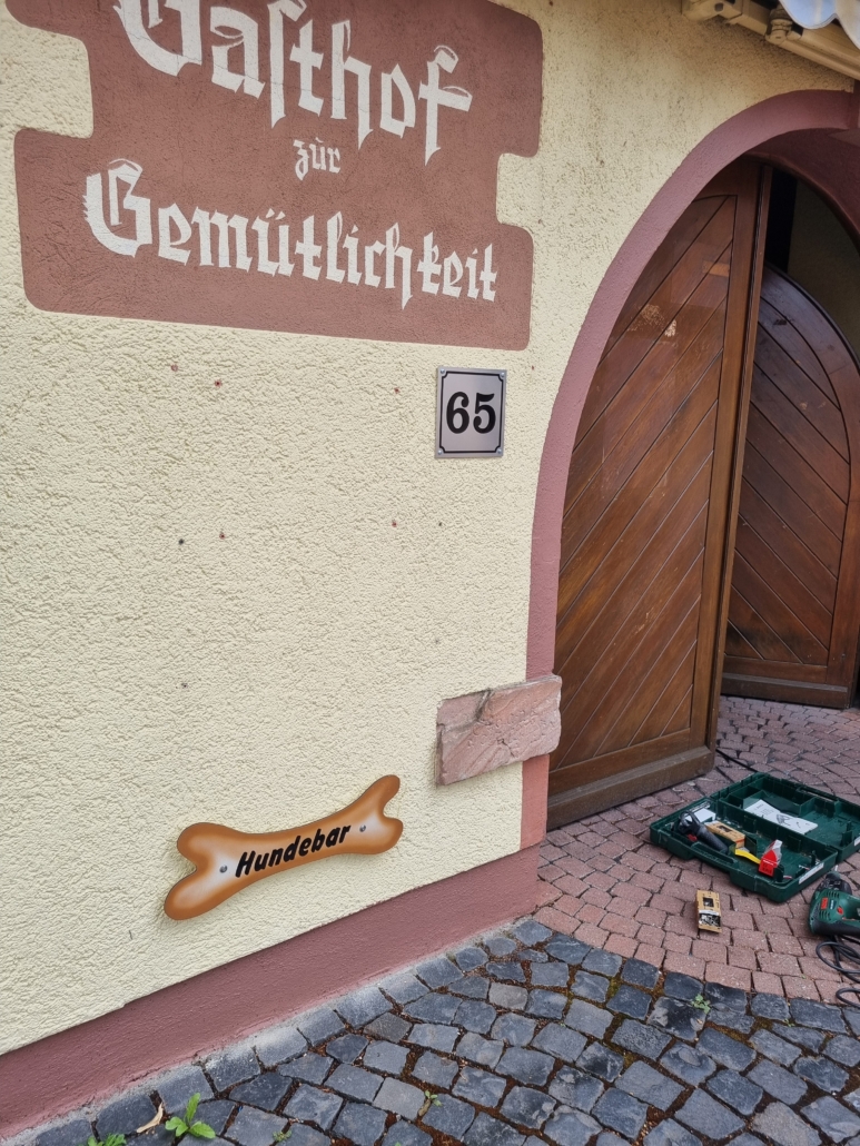 Am Eingang zum Innenhof des Gasthofs zur Gemütlichkeit wird das Schild "Hundebar" montiert